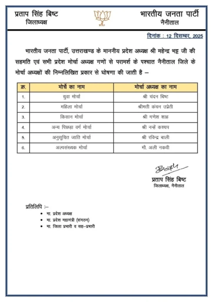 भाजपा ने बागेश्वर जिले में मोर्चा अध्यक्षों की नई टीम घोषित की, छह मोर्चों में...