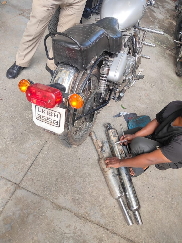 पुलिस का विशेष चैकिंग अभियान लगातार जारी रहेगा, सभी वाहन चालकों से अपील करते हैं कि वह केवल कंपनी द्वारा निर्धारित साइलेंसर का ही उपयोग करें।”