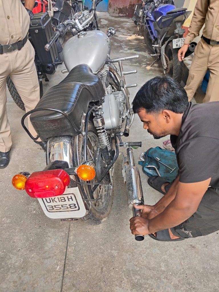1- एक दोपहिया वाहन बुलेट जिसका नंबर uk 18 H 3558 में अवैध रूप से संशोधित साइलेंसर लगाया हुआ पाया गया। जिसक संशोधित साइलेंसर को थाने ले जाकर मौके से ही बदलवाया गया तथा चालानी कार्यवाही की गई।