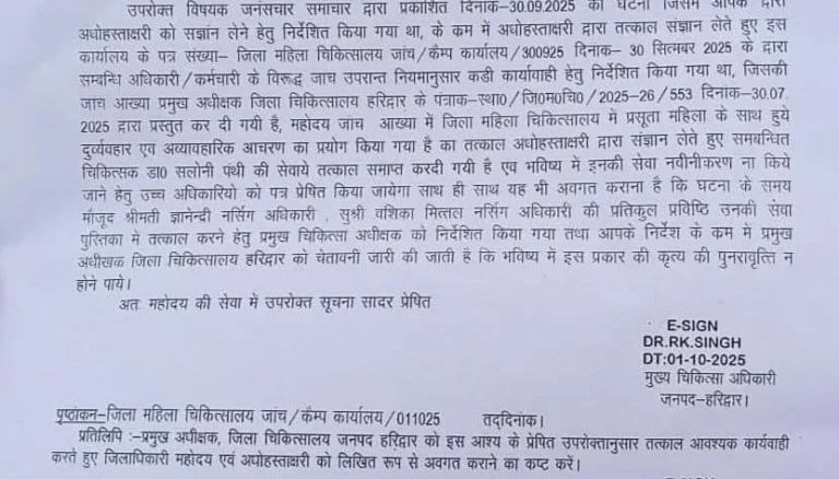 हरिद्वार के महिला अस्पताल में लापरवाही का मामला-महिला डॉक्टर की सेवा की गई समाप्त।