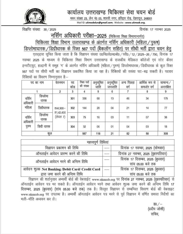 राज्य में बुनियादी स्वास्थ्य सेवाओं की मजबूती के लिये राज्य सरकार निरन्तर प्रयासरत है। इसी कड़ी में आज चिकित्सा शिक्षा विभाग के अंतर्गत संचालित राजकीय मेडिकल कालेजों में नर्सिंग अधिकारियों के रिक्त 587 पदों पर भर्ती प्रक्रिया शुरू कर दी गई है।राज्य चिकित्सा सेवा चयन बोर्ड ने उक्त रिक्त पदों पर सीधी भर्ती के लिये विज्ञापन जारी कर दिया है। उक्त भर्ती हेतु ऑनलाइन आवेदन की प्रक्रिया 27 नवम्बर से शुरू होगी जबकि आवेदन की अंतिम 17 दिसम्बर 2025 निर्धारित की गई है।