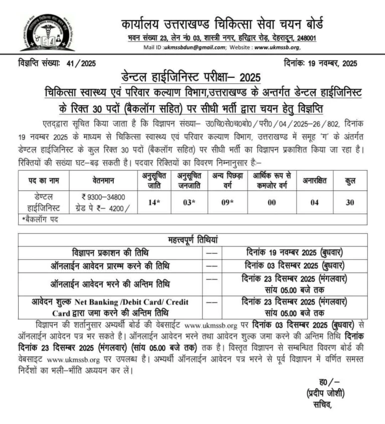 उत्तराखंड कुमाऊँ गढ़वाल रोज़गार देहरादून:(बिग न्यूज) रिक्त पदों पर सीधी भर्ती हेतु विज्ञप्ति जारी देवभूमि खबर नेटवर्क 20 Nov, 2025 ख़बर शेयर करें चिकित्सा स्वास्थ्य एवं परिवार कल्याण विभाग, उत्तराखण्ड के अन्तर्गत डेन्टल हाईजिनिस्ट के रिक्त पदों पर सीधी भर्ती हेतु विज्ञप्ति जारी। Your browser does not support the video tag. More Stories उत्तराखंड कुमाऊँ गढ़वाल रोज़गार देहरादून : 103 नर्सिंग अधिकारी और 30 दंत चिकित्सकों के पदों पर निकली भर्ती देवभूमि खबर नेटवर्क 20 Nov, 2025 उत्तराखंड कुमाऊँ गढ़वाल उत्तराखण्ड शासन ने राज्याधीन सेवाओं में हड़ताल पर अगले छह माह के लिए प्रतिबंध देवभूमि खबर नेटवर्क 20 Nov, 2025 उत्तराखंड कुमाऊँ गढ़वाल उत्तराखंड: CM पुष्कर सिंह धामी ने स्वीकृत किए 170.13 करोड़ रुपये देवभूमि खबर नेटवर्क 19 Nov, 2025
