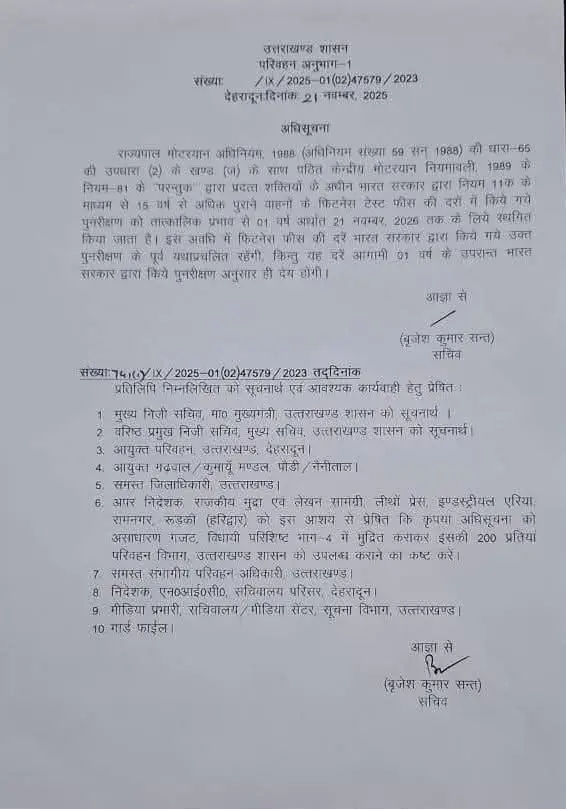 मुख्यमंत्री श्री पुष्कर सिंह धामी के निर्देश पर राज्य सरकार ने उत्तराखण्ड के वाहन स्वामियों को महत्वपूर्ण राहत प्रदान करते हुए पुराने (15 वर्ष) कमर्शियल वाहनों की फिटनेस फीस में वृद्धि को आगामी 01 जुलाई 2026 तक स्थगित कर दिया है। इस संबंध में सचिव,परिवहन श्री बृजेश कुमार संत द्वारा अधिसूचना जारी कर दी गई है।