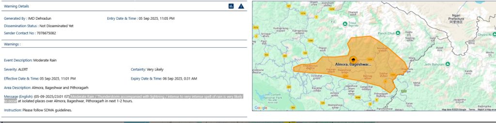 अगले 1-2 घंटों में ( ऑरेंज अलर्ट दिनांक 05 Sep 2025, 11:01 PM बजे से दिनांक 06 Sep 2025, 0:31 AM ) जनपदअल्मोडा, बागेश्वर, पिथौरागढ में अलग-अलग स्थानों पर यथा कौसानी, द्वाराहाट, मुनस्यारी, डीडीहाट, चौकोरी,तथा इनके आस पास के क्षेत्रो मे मध्यम वर्षा / बिजली कड़कने के साथ आंधी / तीव्र से बहुत तीव्र वर्षा होने की संभावना है