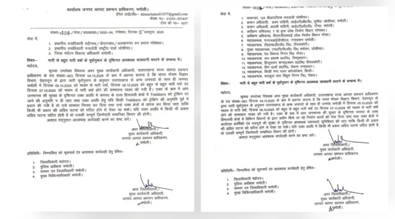 चमोली- भारतीय मौसम विभाग द्वारा प्राप्त पूर्वानुमान के अनुसार 05 से 07 अक्टूबर, 2025 तक जनपद चमोली सहित प्रदेश के अन्य जनपदों में भारी से बहुत भारी वर्षा होने की संभावना है। जिसे देखते हुये जिला प्रशासन द्वारा उच्च हिमालयी क्षेत्रों ट्रेकिंग गतिविधियों पर रोक लगाने के साथ साथ सभी विभागों एवं कार्यदायी संस्थाओं को जोखिम वाली जगहों पर मजदूरों से कराये जा रहें निर्माण कार्य पर रोक लगाने के निर्देश दिए गए हैं। साथ ही पूर्व में दी गई ट्रेकिंग अनुमतियाँ तत्काल प्रभाव से निरस्त कर दी गई हैं।अपर जिलाधिकारी विवेक प्रकाश ने जनपदवासियों से अपील की है कि भारी वर्षा की स्थिति को देखते हुए सभी लोग सतर्कता और सावधानी बरतें। उन्होंने कहा कि विशेषकर ऊँचाई वाले क्षेत्रों तथा संवेदनशील इलाकों में अनावश्यक आवाजाही से बचें।उन्होंने यह भी कहा कि भारी वर्षा की स्थिति में भूस्खलन, मार्ग अवरोध और नदी-नालों के जलस्तर में वृद्धि की संभावना रहती है, अतः लोग जोखिम भरे क्षेत्रों से दूर रहें, अफवाहों पर ध्यान न दें और केवल प्रशासन द्वारा जारी आधिकारिक सूचनाओं पर ही भरोसा करें।