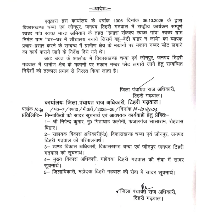 मुख्यमंत्री श्री पुष्कर सिंह धामी ने सोशल मीडिया पर वायरल हुए पत्र का संज्ञान लेते हुए जिला पंचायतराज अधिकारी, टिहरी गढ़वाल के आदेश को तत्काल प्रभाव से रद्द करने के साथ ही मामले की पूरी जांच कराने और दोषियों के खिलाफ आवश्यक कार्रवाई सुनिश्चित करने के निर्देश भी जारी किए हैं।