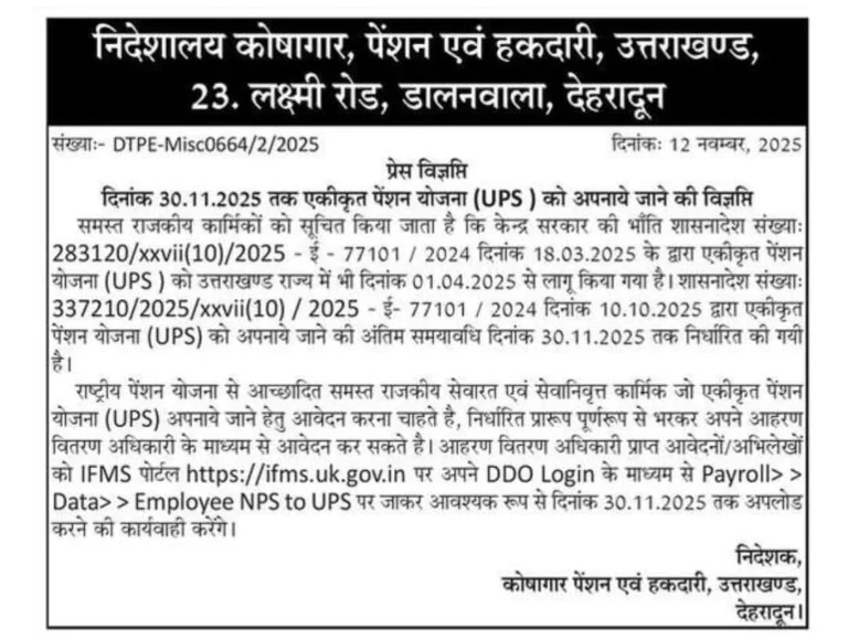 राष्ट्रीय पेंशन योजना से आच्छादित समस्त राजकीय सेवारत एवं सेवानिवृत्त कार्मिक जो एकीकृत पेंशन योजना (UPS) अपनाये जाने हेतु आवेदन करना चाहते है, निर्धारित प्रारूप पूर्णरूप से भरकर अपने आहरण वितरण अधिकारी के माध्यम से आवेदन कर सकते है। आहरण वितरण अधिकारी प्राप्त आवेदनों/अभिलेखों को IFMS पोर्टल https://ifms.uk.gov.in पर अपने DDO Login के माध्यम से Payroll> > Data> > Employee NPS to UPS पर जाकर आवश्यक रूप से दिनांक 30.11.2025 तक अपलोड करने की कार्यवाही करेंगे।