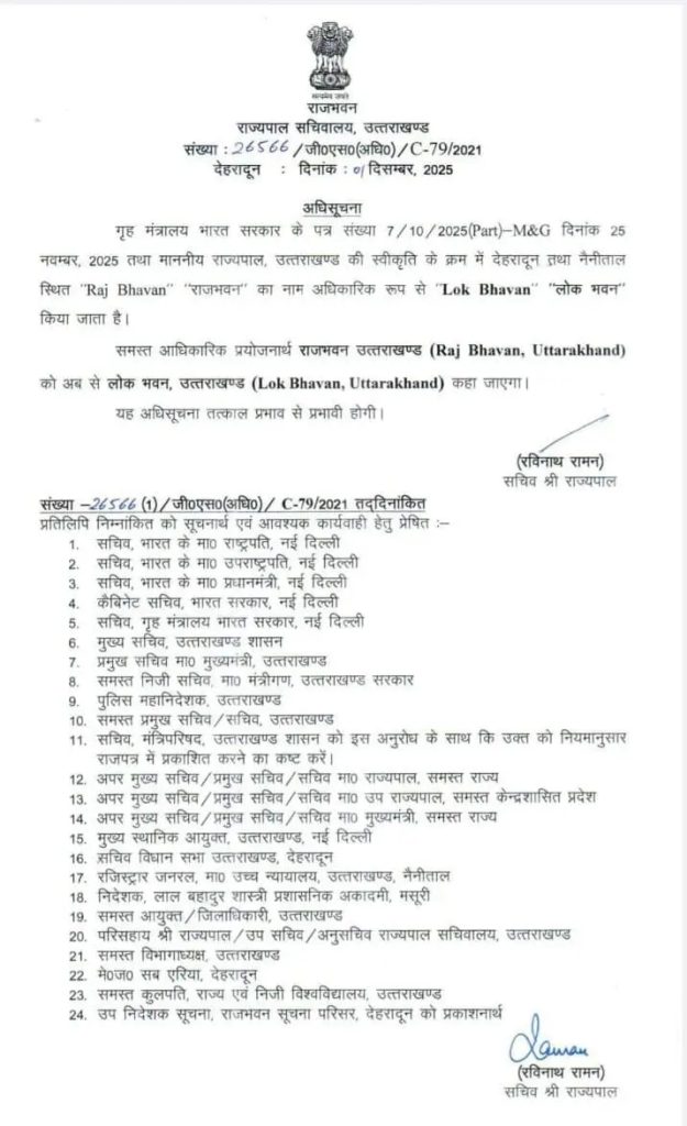 उत्तराखंड कुमाऊँ गढ़वाल उत्तराखण्ड के राज भवन अब लोक भवन के नाम से जाने जाएंगे। देवभूमि खबर नेटवर्क 01 Dec, 2025 ख़बर शेयर करें Your browser does not support the video tag. More Stories उत्तराखंड कुमाऊँ गढ़वाल उत्तराखंड: किसानों ने मुख्यमंत्री धामी का किया उत्साहजनक स्वागत, “किसान पुत्र” की उपाधि से किया सम्मानित देवभूमि खबर नेटवर्क 01 Dec, 2025 उत्तराखंड कुमाऊँ बागेश्वर:जिलाधिकारी की अध्यक्षता में जनता दरबार,डीएम ने अधिकारियों को जनहित में ईमानदारी और जिम्मेदारी से कार्य करने के दिए निर्देश देवभूमि खबर नेटवर्क 01 Dec, 2025 उत्तराखंड कुमाऊँ गढ़वाल उत्तराखंड: मुख्यमंत्री के आश्वासन के बाद चौखुटिया आंदोलन 20 दिन के लिए स्थगित देवभूमि खबर नेटवर्क 01 Dec, 2025