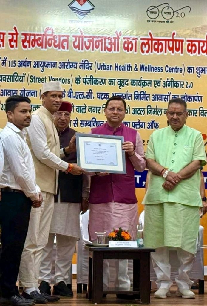 अध्यक्ष नगर पालिका सुरेश खेतवाल ने ये सम्मान सीएम धामी से प्राप्त किया ,इस बड़ी उपलब्धि पर उन्होंने कहा