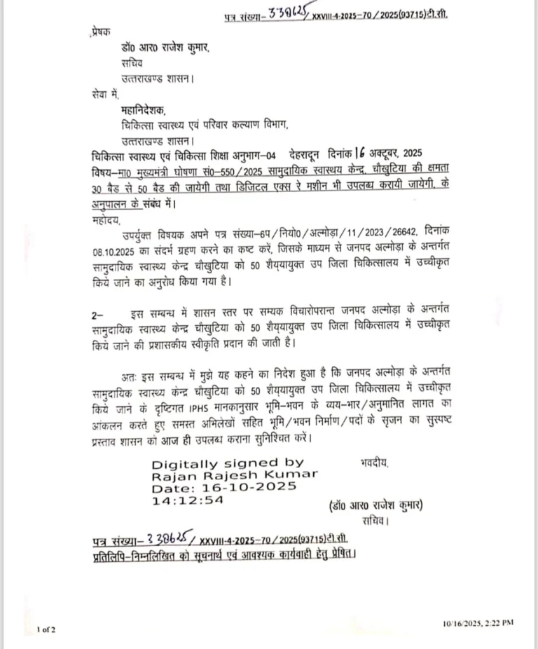 चौखुटिया में अस्पताल के लिए 50 बेड मंजूर करते हुए सीएम धामी ने स्वास्थ्य विभाग के सचिव का जवाब तलब करते हुए पूछा कि इसकी फाइल एक साल से क्यों और कहां लटकी रही?