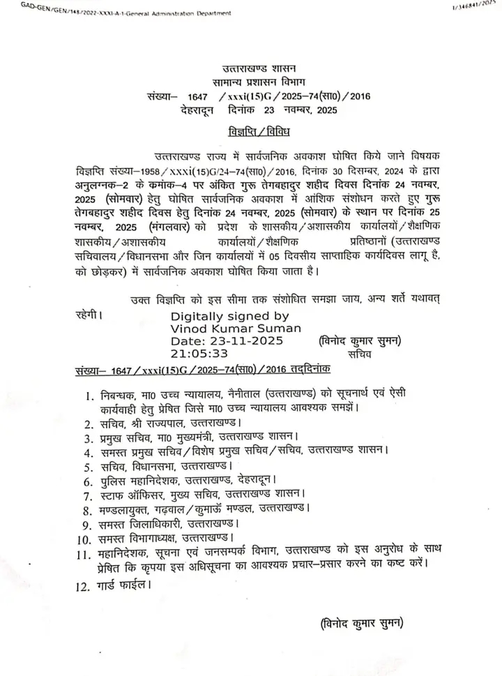 उत्तराखंड:गुरू तेग बहादुर शहीदी दिवस दिनांक 24 नवम्बर, 2025 (सोमवार) हेतु घोषित सार्वजनिक अवकाश में आंशिक संशोधन करते हुए दिनांक 25 नवम्बर, 2025 (मंगलवार) को सार्वजनिक अवकाश घोषित किया गया