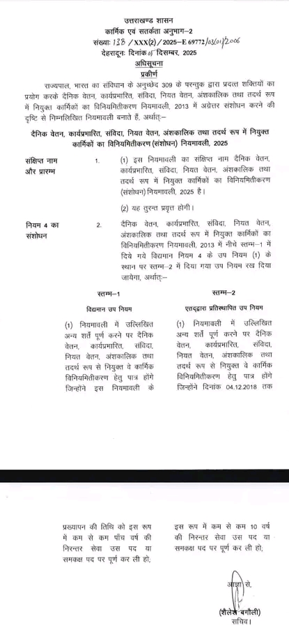 उत्तराखंड:महत्वपूर्ण निर्णय दैनिक वेतन, कार्यप्रभारित, संविदा, नियत वेतन, अंशकालिक तथा तदर्थ रूप में नियुक्त कार्मिकों का विनियमितीकरण (संशोधन) नियमावली-2025 जारी
