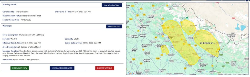 अगले 03 घंटों में ( येल्लो अलर्ट दिनांक 08 Oct 2025, 6:22 PM बजे से दिनांक 08 Oct 2025, 9:22 PM बजे तक ) जनपद – अल्मोडा, देहरादून, नैनीताल, पौडी गढ़वाल, टेहरी गढ़वाल, उधम सिंह नगर, उत्तर काशी, बागेश्वर, चमोली, पिथौरागढ, रूद्र प्रयाग, हरिद्वार में कुछ स्थानों पर यथा – पुरोला, चकराता, मोरी, चिन्यालीसौड़, ऋषिकेश, देवप्रयाग, श्रीनगर, सोनोरायाग, केदारनाथ, मुनश्यारी, बेरीनाग, थराली, जोशीमठ, तथा उनके आसपास के क्षेत्रों में बिजली/तीव्र वर्षा/तेज हवा (30-40 किमी प्रति घंटे) के साथ गरज के साथ तूफान आने की संभावना है।