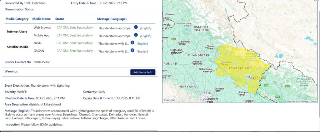 अगले 03 घंटों में ( येल्लो अलर्ट दिनांक 06 Oct 2025, 9:11 PM बजे से दिनांक 07 Oct 2025, 0:11 AM बजे तक ) जनपद – अल्मोडा, बागेश्वर, चमोली, चंपावत, देहरादून, हरिद्वार, नैनीताल, पौडी गढ़वाल, पिथौरागढ, रूद्र प्रयाग, टेहरी गढ़वाल, उधम सिंह नगर, उत्तर काशी में अलग-अलग स्थानों पर यथा – केदारनाथ, बद्रीनाथ, कपकोट, सोनप्रयाग कर्णप्रयाग, चौकुटिया, ऋषिकेश, देवप्रयाग, चिन्यालीसौड़, डोईवाला, मसूरी, बड़कोट, पुरोला, जानकी चट्टी, बेरीनाग, रामनगर, तथा इनके आस पास के क्षेत्रो मे बिजली कड़कने के साथ गरज के साथ तूफान/तेज बारिश/तेज हवा (30-40 किमी प्रति घंटा) चलने की संभावना है।